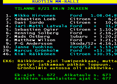Tuloksia EK1:ltä, ja koko rallista erikoiskokeittain voit seurata reaaliaikaisesti WRC:n sivuita. Tarjolla on EK-ajat ja Split Times, josta voi seurata EK:n etenemistä väliajoilla.