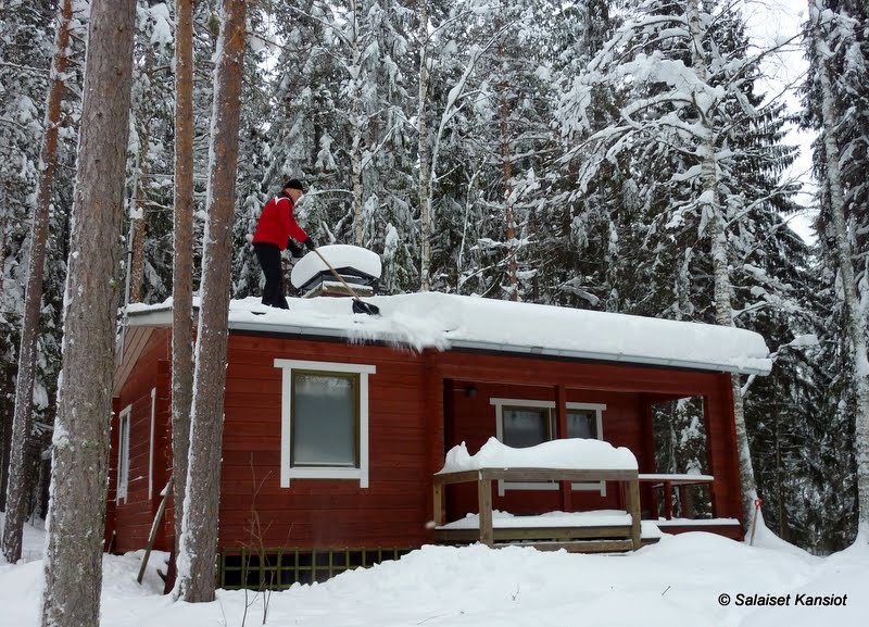 Lisäsimme mökin lintulaudan siementäydennysreissuun tarpeellisen urakan, eli putsasimme samalla käynnillä mökkien katot. Katoilla olikin yllättävän runsaasti lunta, jopa noin 60 cm. Poikakin teki töitä ihan tosissaan! Hyvä lämminhän tuossa hommassa tuli. Enää ei kuitenkaan tarvinne lumitaakan painosta huolehtia.