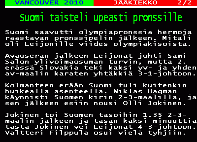 O-HOH! Taitaa pojat lukea tätä minun kiekkoraamattua, kun juuri se mitä toivoin on tapahtunut ja juuri niiltä pelaajilta, joilta sitä tasoa toivoinkin!Taidan keskiviikkona toivoa Viking Loton… Onnea kovasti koko joukkueelle ja niille, jotka vielä oikeasti uskoivat Suomen voittoon, ja jaksoivat valvoa!