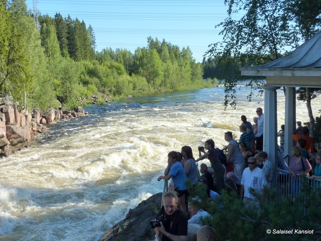 Meidän vieressä (minun ja tuon kameramiehen välissä) oli yksi perhe, johon kuului pari +10-v. kakrua, tyttö ja poika. Jotenkin käsittämättömältä tuntui kuunnella äidin ohjeita, kun toinen kakruista sanoi, ettei hän näe kunnolla koskelle. Tämä siis ennen tapahtumaa. Niin, äiti opasti sitten lapsiaan menemään tuohon kapealle tasanteelle. Aidan väärälle puolelle! Perheen vanhemmille ei tule vahingossakaan mieleen, että miksiköhän tuonne yleensä on laitettu aitoja? No, siihenhän ne pennut sitten istahtivat… Miten tyrmistyttävän tyhmiä voi vanhemmat olla? Sitten hösöisä selittää kuinka se vesi nousee pari metriä uomassa, ja kuinka kauan sen tulo juuri tähän paikkaan asti kestää. Hän on nähnyt tämän aikaisemmin jne, jne. Onneksi hymyilevä järkkäri tuli opastamaan lasten vanhempia, että ”Lasten pitää tulla aidan oikealle puolelle ja molemmat jalat maahan. Eli aidallakaan ei roikuta!” Hetken päästä, järkkärin jo mentyä, hösöisä sitten tokaisi, että Imatran kaupungilla on kova vastuu ja tällaisia riskejä ei oteta. ”Juu, lehdessä lukisi, että kaksi lasta hukkui…” Mutta hän voi ottaa niitä kakrujensa kanssa?! Oikeasti, miten noita voi edes liikkua vapaina?