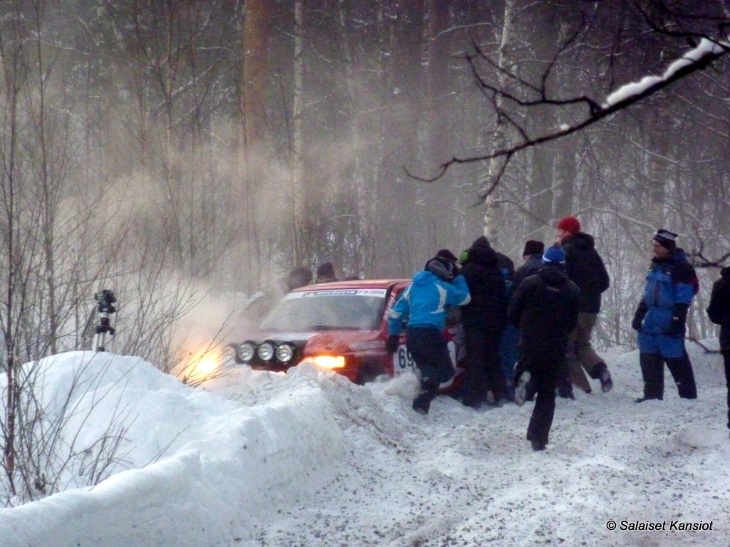 Yhteensä näimme n. 13-14 selkeää ulosajoa, joista noin puolet olivat ”kaatoja”. Noin 20 autokuntaa selvitti paikan upeasti taistellen, tai selkeästi tuurilla lumipenkkaa siirrellen ja hurjasti pöllytellen. Tämä oli selkeästi yksi parhaista rallien katselupaikoista ikinä!