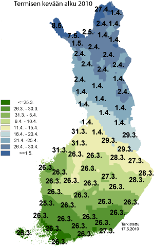 ”Termisen kevään aikana vuorokauden keskilämpötila on 0 ja +10 asteen välillä. Kolmen kuukauden tilastoissa kevääseen kuuluvat maalis- huhti- ja toukokuu. Kevään aikana lumet sulavat ja terminen kasvukausi pääsee alkuun.