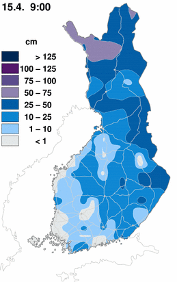 Sillä onkin ollut nopea vaikutus lumen pinnan nopeaan laskuun. Noin puolessa Suomessa oli vielä maanantaina yli puolen metrin hanget. Tänään, aamuisessa mittauksessa vain hieman Napapiirin yläpuolisessa osassa on lunta polveen asti. 10-25 cm:n alue laajenee ja lähestyy ”uhkaavasti” lännestä ja etelästä päin. Kolat ja lumilapiot on vietävä turvaan!