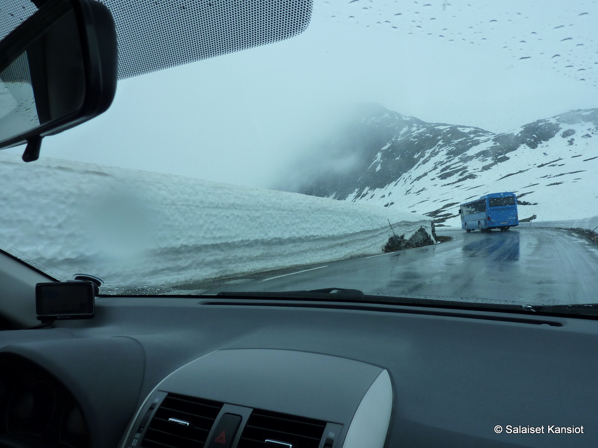 Tiesimme, jo Åresta lähtiessämme, että joudumme jossain vaiheessa päivää ajamaan Ruotsia halkovan sadealueen läpi. Kohtasimme sen voimakkaan ukkosrintaman Moran ja Torsbyn välillä. Hurjaa salamointia pilvissä, ja suoraan maahan. Näimme kymmeniä ja taas kymmeniä kirkkaita salamoita! Eräällä, noin puolen kilometrin pätkällä oli satanut niin paljon rakeita, että ne olivat kinostuneet valleiksi tien reunoille. Eipä ole moista tallentunut aikaisemmin mieleen.