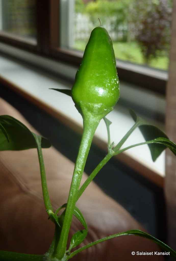 Etualalla on ”hujoppi”, jonka oletan edustavan jotain eri lajiketta, kuin nämä minulle tutummat nimettömät chilit. Kyseessä saattaa olla eräs pitkä ja kapea chili, ei_niin_tulinen, nimeltään… Ei harmaintakaan aavistusta!