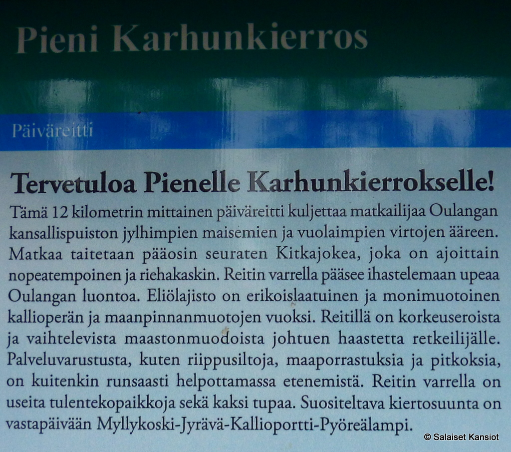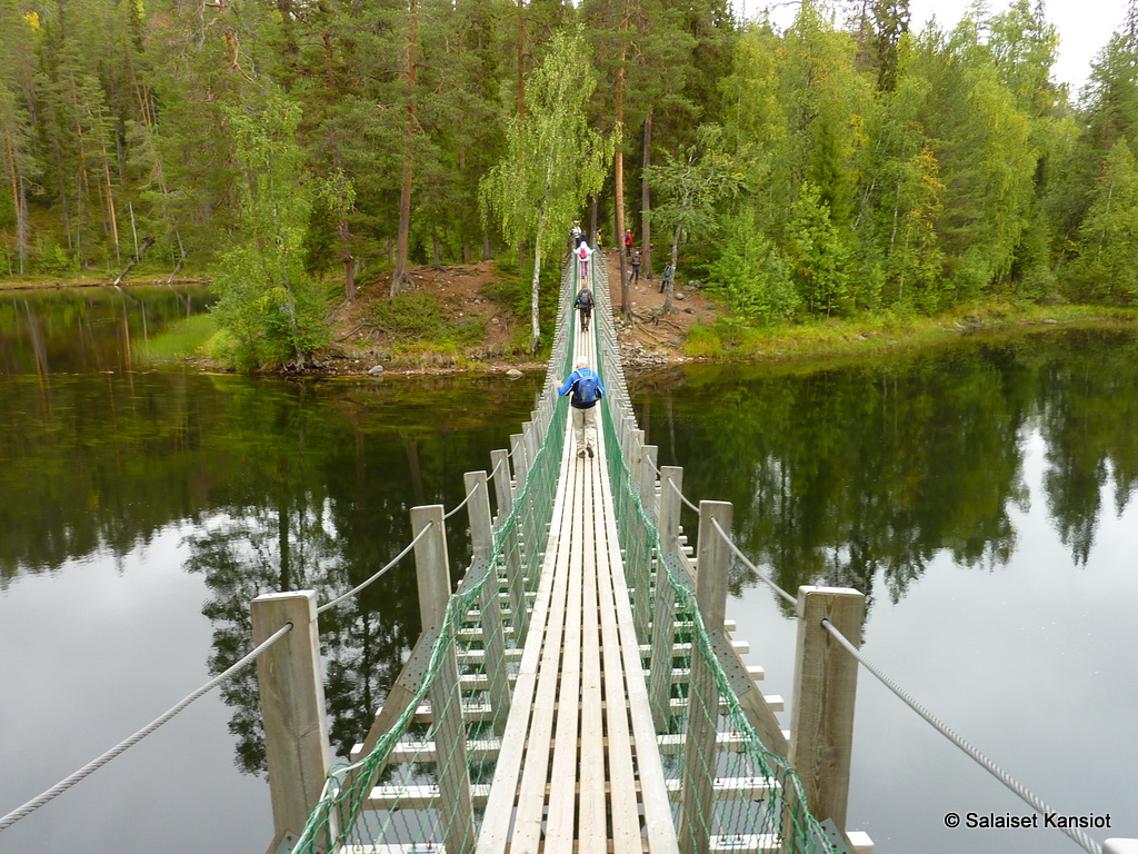 Eli kuten noista kuvista voi jo päätellä, että varsinaisia vaelluskenkiä ei välttämättä Pienellä Karhunkierroksella tarvitse. Toisaalta kumisaappailla en lähtisi retkeä taivaltamaan. Tukevat kengät säästävät jalkoja.
