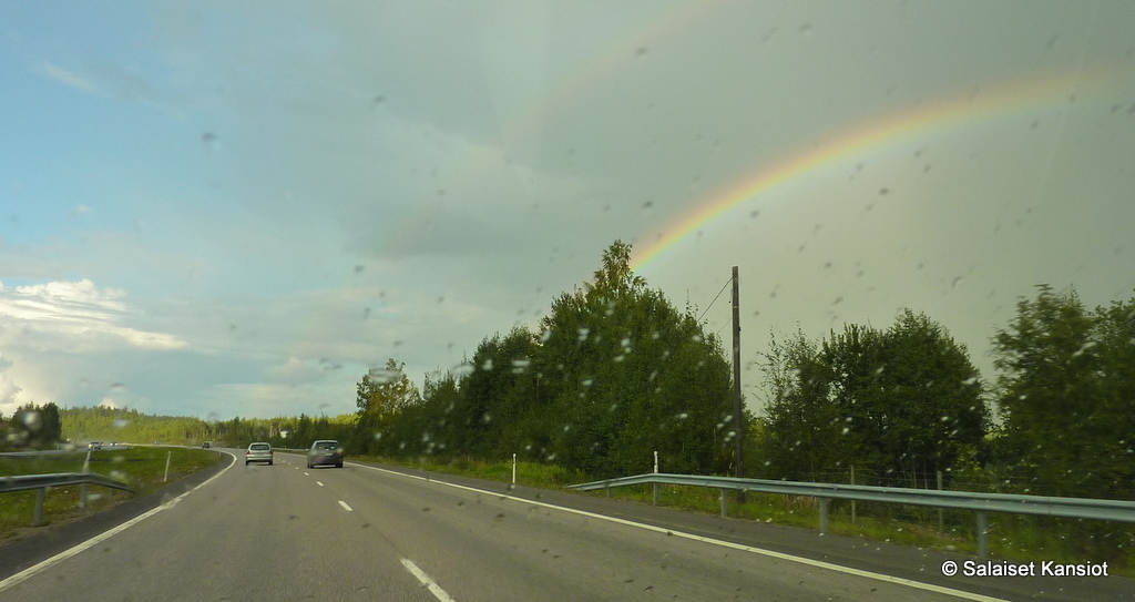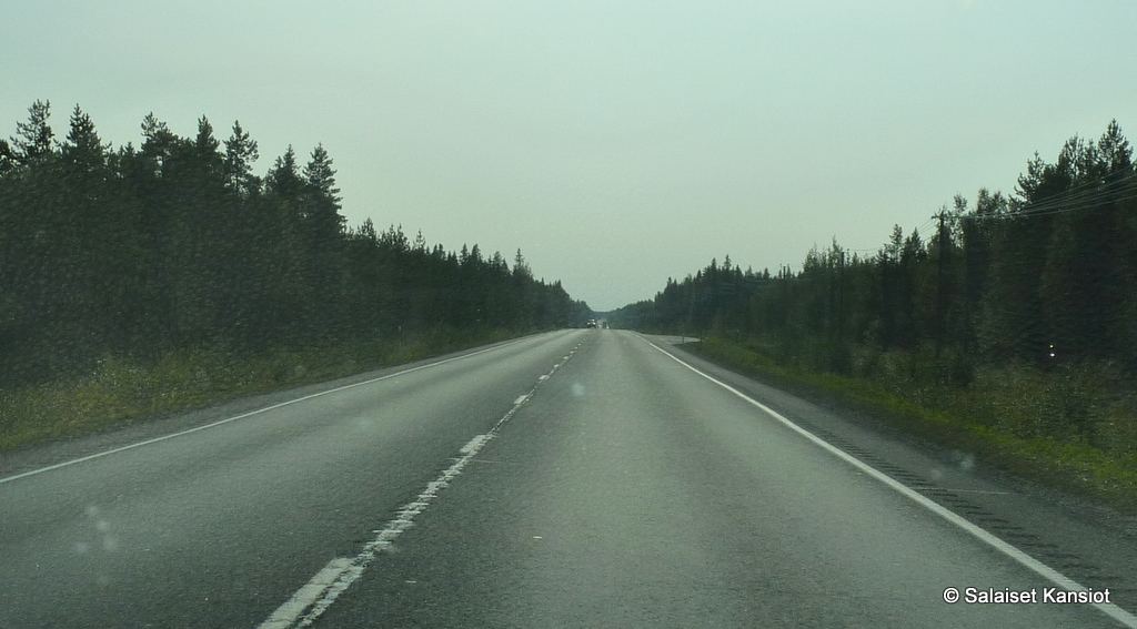Matkapäivä sujui odotusten mukaisesti. Sadekuurot yleistyivät vasta Puolangan jälkeen. Kovimmat kuurot huuhtelivat maata ja autoa Suomussalmen kohdilla. Eläimiä näkyi matkalla useita! Supikoirien harventaminen oli ollut rajua, koska raatoja oli jo ennen Kuopiota kertynyt kymmenkunta. Pari haukkalintua kyykki kelopuiden rungon tuntumassa. Ja sitten…