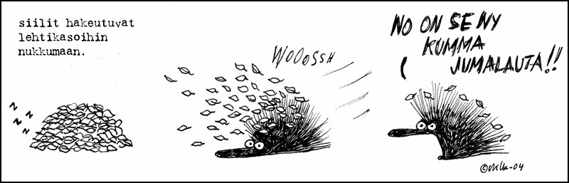 Talviunille On 11/10/2011 Tekijä jataala Kiroileva siili vaipuu kohta horrokseen! Uutisesta kertoi Seinäjoen Sanomat Se siitä sitte! Jaa tämä: Jaa X:ssä(Avautuu uudessa ikkunassa) X Jaa Facebookissa(Avautuu uudessa ikkunassa) Facebook Tykkää Lataa...