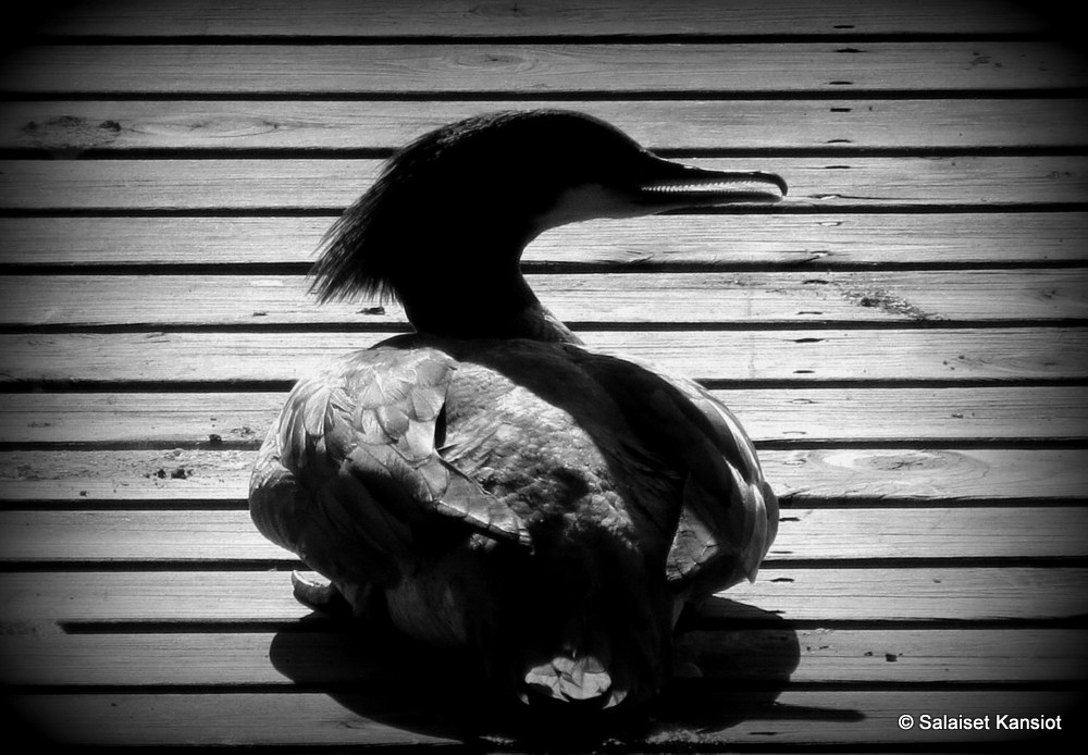 ”Pääosin harmaa naaras, kaulassa jyrkkä väriraja”
