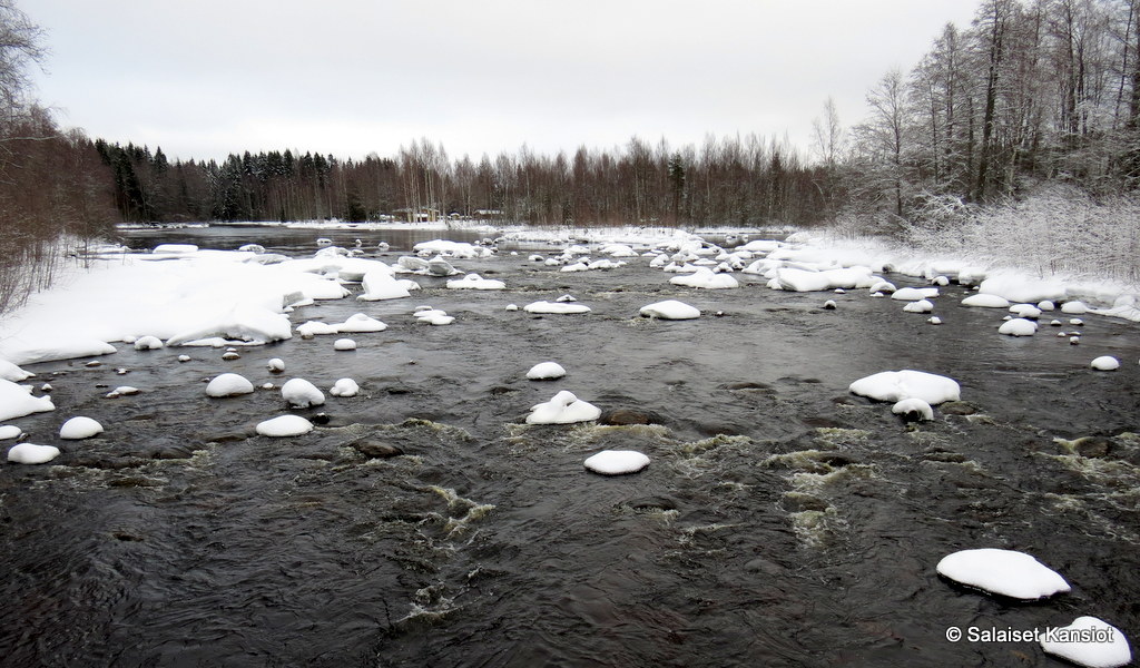 Yöllä ja aamulla sateli lunta ja oli kovin harmaata. Lunta ei ollut satanut niitä ennustettuja 15 senttiä, vaan noin viisi senttiä ihan kevyttä pakkaslunta. Kävimme Muoniossa kaupassa ja katsomassa, että olisiko Äijäkosken kohdalla sulaa. Eipä ollut koko tietä aurattu joenvarteen. Kaupasta saimme kuitseskin tarvittavat.