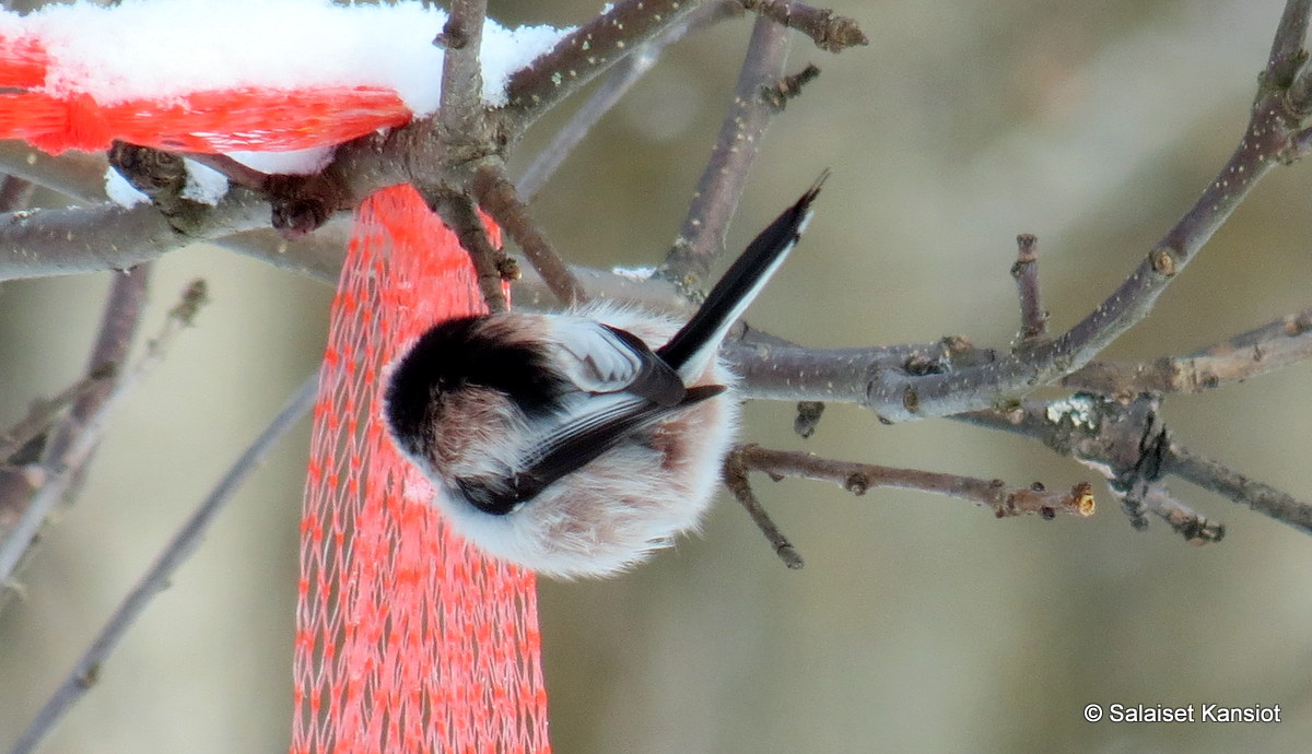 F1-lähetyksen aikoihin huomasin vaaleita lintuja talipötkön ympärillä. Innostuneesti ja nopeasti huusin Ässän alakertaan tipuja ihmettelemään. Ässä muuten teki uuden ennätyksen, noin 3s, yläkerrasta alas! Oletin, että pyrstötiaisia olisi parvilintuna enemmänkin, mutta tällä kertaa niitä oli vain kaksi. Vierailu oli niin pikainen, että ehdin noutaa kameran työhuoneesta ja saada vain nämä kaksi kuvaa. Lintu on niin vilkasliikkeinen, ettei useampi kuva ollut mahdollista. Kaiken lisäksi eräs sinitiainen oli kovin epäkohtelias vieraille hätistäessään pyrstötiaiset pois ”omalta” talipötköltään.