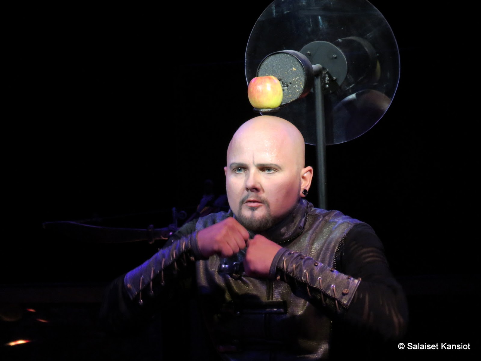 Jalkajousimestarilla on syystäkin huolestunut ilme, kun hänen 16 jalkajoustansa on viritetty ampumaan toinen toistaan, niin että viimeinen nuoli osuu päänsä päällä olevaan omenaan. Jep! Esitykset jatkuu!