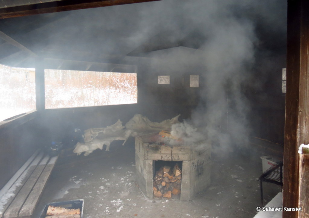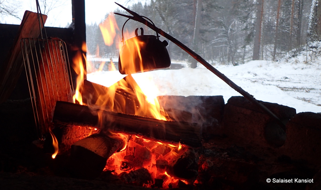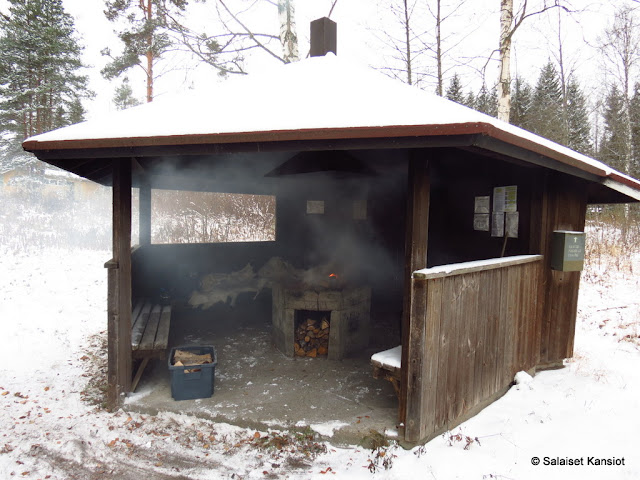 Mökki lämpesi mukavasti, ja joimmekin ensin kahvit sisätiloissa, ja kun kroppa oli saanut lisäenergiaa lämmöntuotantoon, siirryimme makkaranpaistoon ulos.