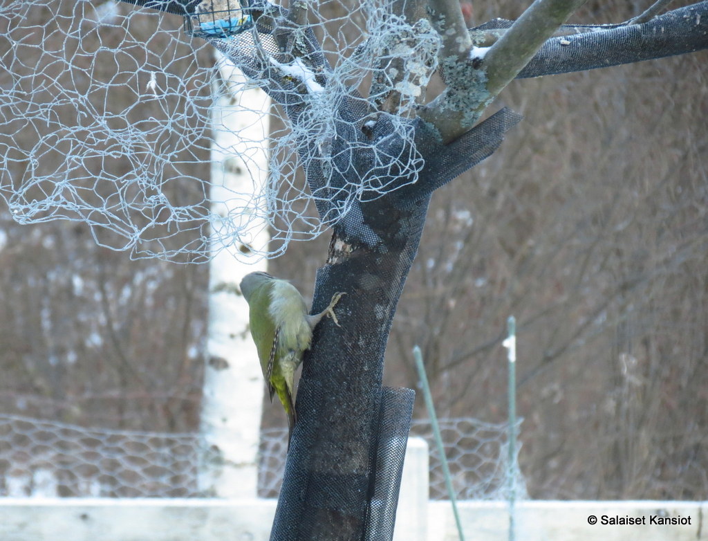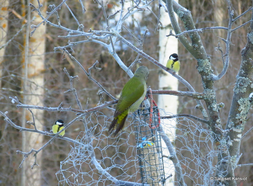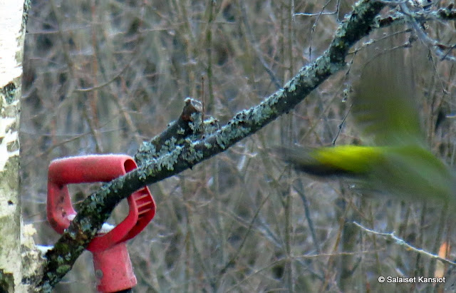 Kävimme eilen mökillä tarkastamassa siementilanteen, ja huomasimme samalla, että tikka oli hieman tuhonnut automaattia. Otimme automaatin kyytiin kaupunkiin ja korjaukseen. Tyhjästä oluttölkistä ja ”jesarista” sain hyvän korjausavun nokittuun kohtaan, ja tänään kävimmekin aamupäivällä viemässä ruokinta-automaatin takaisin omalle paikalleen roikkumaan.