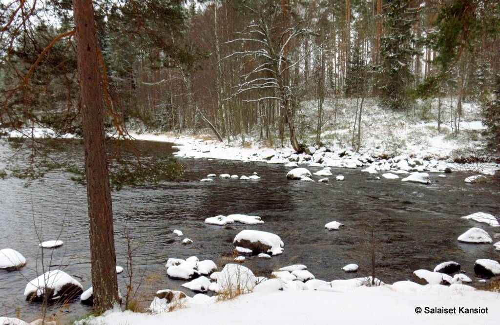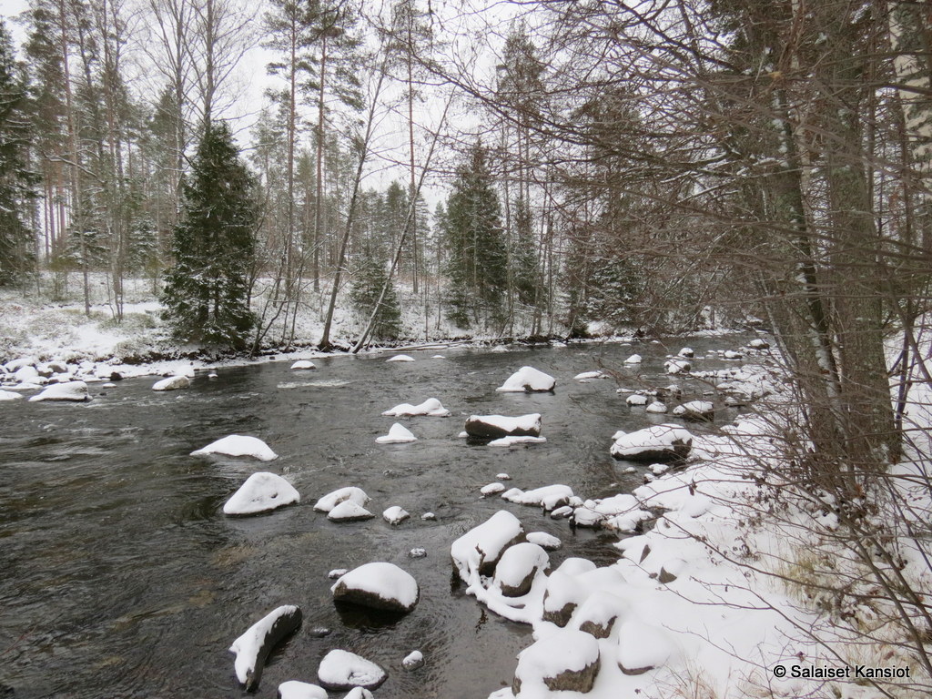 Kävimme Jusun kanssa tutkailemassa lähistön virtapaikkoja ja etsimässä koskikaraa. Päädyimme Mäntyharjun Kaivannonkosken laavulle.