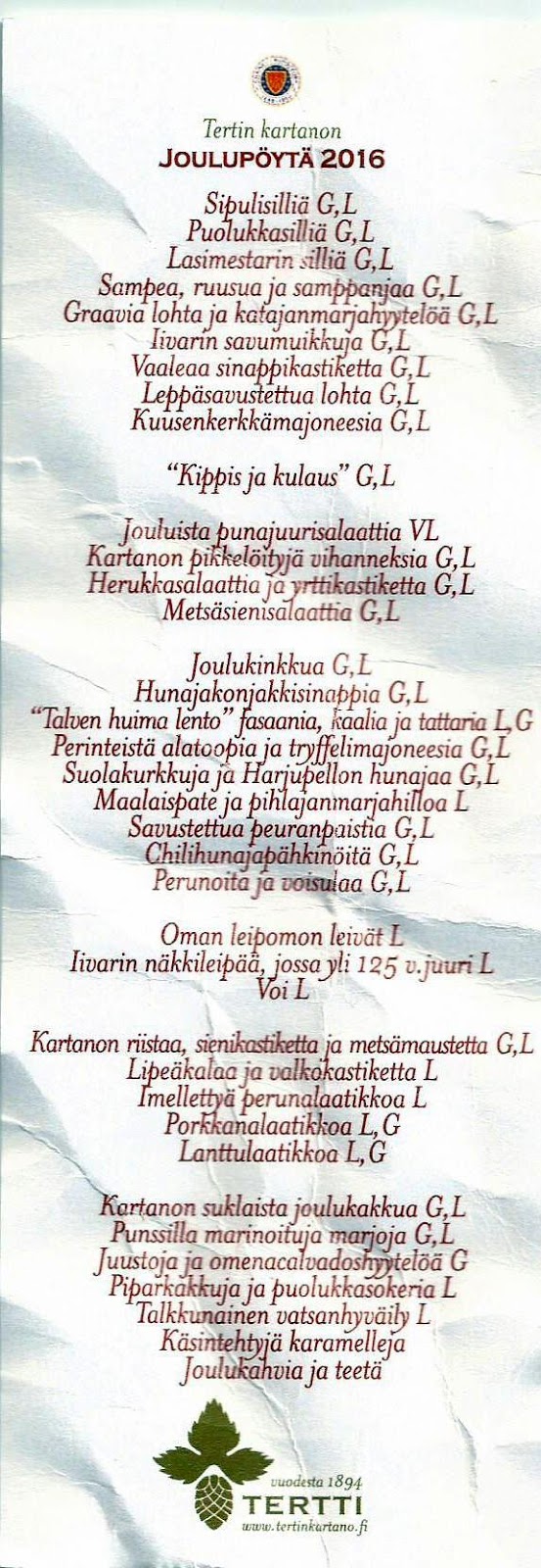 Kävimme tänään juhlistamassa yhdessä, Pappa co. ja jälkikasvu vesoineen, joulua Tertin Kartanossa herkullisella ruokailulla. Se oli taas yhtä täynnä herkullisia erikoisia lähimetsien herkkuja, kuin ennenkin. Kerran vuodessa on tämäkin hyvä kokea!