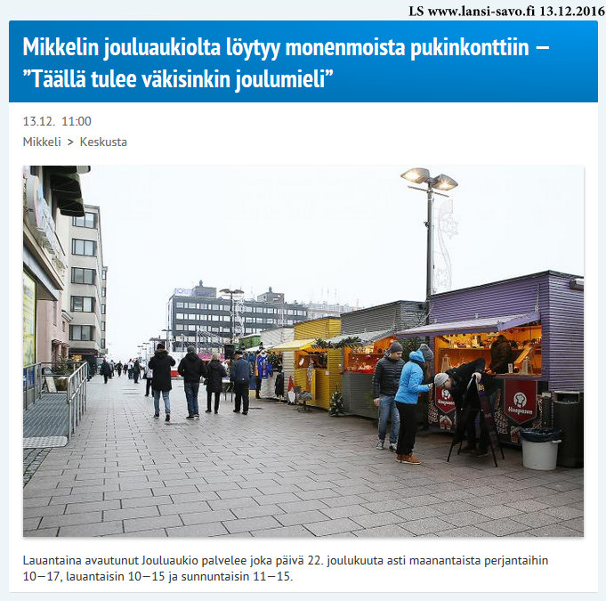 Ajatus näiden ”joulukoppien” tuomisesta takaisin mikkeliläisille jouluajan myyntejä varten on toteutuneenakin aika tuore. Jostain syystä joulumyynti on itsepäisesti sijoitettu torin reunalle ja Stellan läheisyyteen.