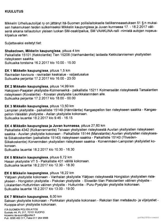 SM Vaakuna-ralli 2017 reitti
