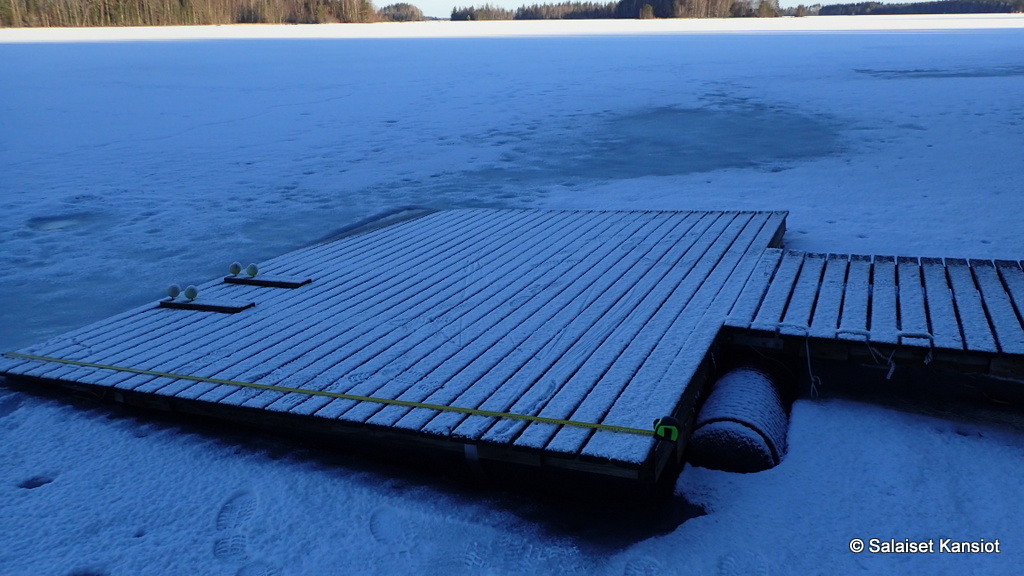 Olimme pitäneet laituria jäissä jo ”vuosia”, eikä tälläistä jäätyy/sulaa/jäätyy/sulaa hisseilyä aikaisemmin oltu koettu. Tämä talvi osottautui liian hankalaksi meidän laiturille.