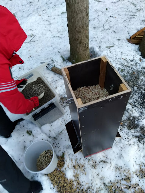 Auringonkukkaa, kauraa, pähkinöitä ja kiinnitimme vielä yhden talipötkön.