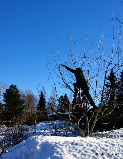 rungoilla ja oksilla yhtä hyvin pää ylös- kuin alaspäinkin.